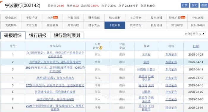 宁波银行2024年的增长逻辑以规模扩张为基础、息差韧性为核心、风险管控为保障、资本内生为支撑,通过差异化战略和数字化转型,在行业分化格局中实现“量、质、效”三重突破。2025年一季度,宁波银行继续遵循这一增长逻辑,在面对复杂严峻的外部经济形势和激烈的行业竞争时,宁波银行一季度的业绩表现,超乎市场预期。进入2025年有8家机构对宁波银行评级,8家机构中有5家给出“买入”,三家给出“增持”,机构对宁波银行信心十足。