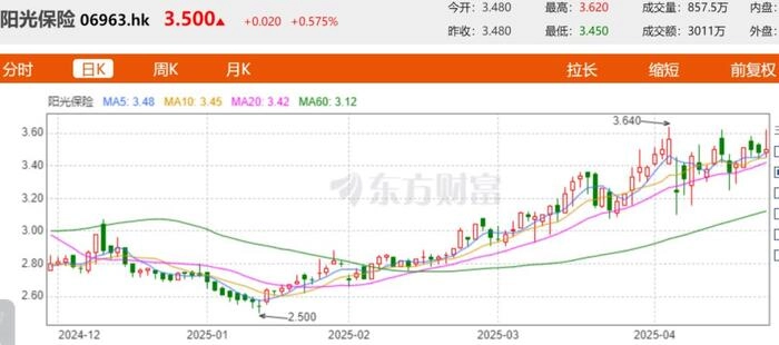 不俗的业绩表现,让阳光保险在资本市场也颇受青睐。进入2025年以来股价由2.75港元涨至4月27日收盘的3.50港元,涨幅达27.2%。一举扭转2024年全年股价下跌35%的局面,作为一家国内知名民营保险服务集团,阳光保险自2022年12月9日上市后,股价就一路走低,长期在低位徘徊,相较上市发行价5.83港元,下跌40%,市值蒸发超200亿港元。但进入2025年其股价明显回暖。截至4月27日收盘,阳光保险最新市值为402.6亿港元。