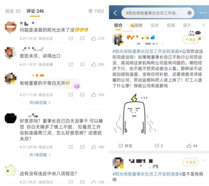 随后该事件被冲上热搜,网友热评阳光保险凌晨2点半召开的关于高效的会议,大量出现的是质疑声。有网友称:“董事长开完会可以回去睡到下午,牛马们第二天8点还要打卡”、“开会到凌晨,看起来公司效率提升的不明显啊”、“开会到凌晨,与高效和科学管理,确定这不是反讽?”