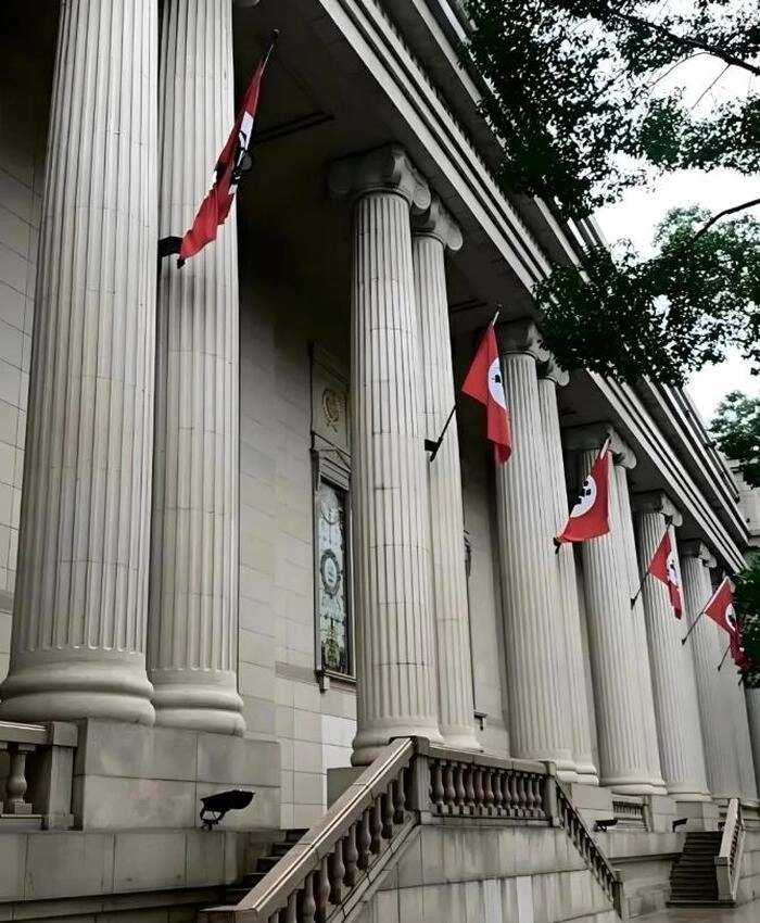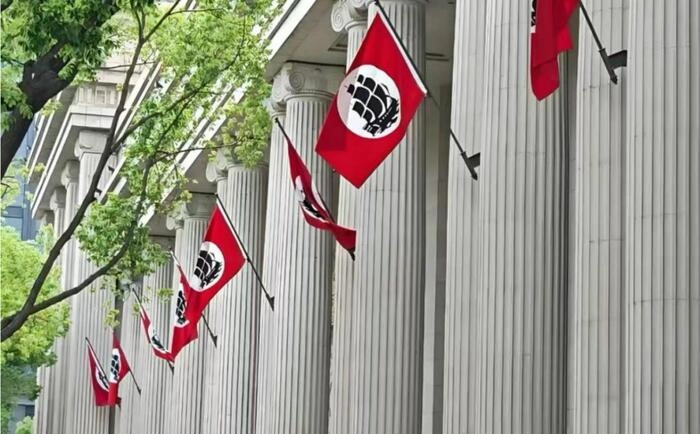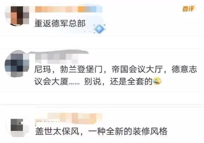 有网友看到海澜之家总部大楼的第一眼就是像“XX总部”,不仅建筑风格比较像,就连保安的制服以及随处可见的旗帜,都很难想象不是故意模仿。总部大楼最引人注目的,是其对欧式建筑元素的极致还原,旗帜设计,红底白圆黑徽的三色旗帜阵列,与建筑顶部的尖塔相映,制服体系,安保人员的束腰皮带、大皮鞋及左臂徽章,这样的多种元素结合在一起,被网友质疑“神似1933年XX国会大厦场景”。