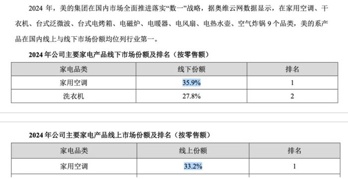 美的援引的数据同样也是奥维云网,不过是细化到9个品类之中,该网数据显示美的系产品2024年在国内线上与线下市场份额均位列行业第一。美的在财报中统计的依据是“按零售额”,这样情况下美的家用空调的线下市场份额为35.9%,排名第一;家用空调的线上市场份额为33.2%,同样排名第一。