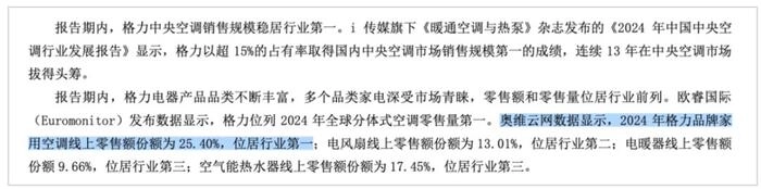 格力援引相关行业杂志的数据,称格力在国内中央空调市场连续13年拔得头筹外,还援引奥维云网数据,2024年,格力品牌家用空调线上零售额份额为25.40%,位居行业第一。