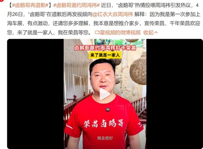 4月26日周鸿祎在自己的自媒体账号发布“荣昌喊我吃卤鹅,这就去”的视频,预告了他的荣昌之旅。接着,周鸿祎表示“马上就去荣昌!”,并晒出与荣昌区委书记的对话截图,承诺“不仅要吃卤鹅,还要为地方产业发展献计献策”。该视频获赞超200万,并在4月27日真的现身荣昌和卤鹅哥相见。