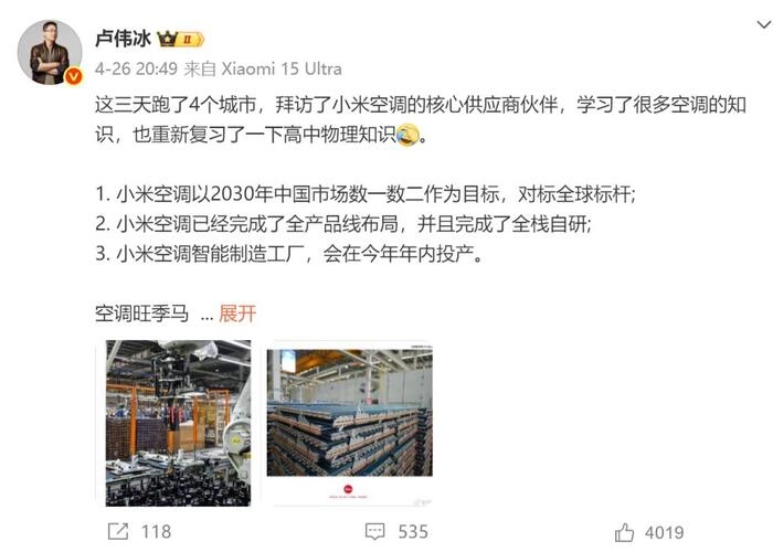 中国家电网文章指出,小米集团合伙人、总裁卢伟冰曾在微博表示,小米空调已完成全产品线布局和全栈自研,小米空调智能制造工厂将于今年年内投产。