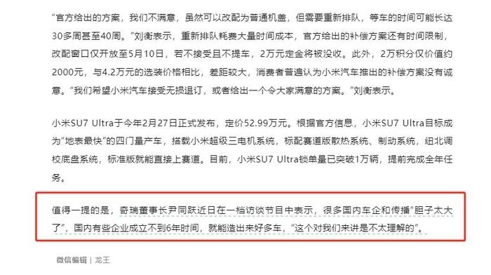《第一财经》报道在《小米SU7 Ultra陷“虚假宣传”争议》文末写道:奇瑞董事长尹同跃近日在一档访谈节目中表示,很多国内车企和传播“胆子太大了”,国内有些企业成立不到6年时间,就能造出来好多车,“这个对我们来讲是不太理解的”。