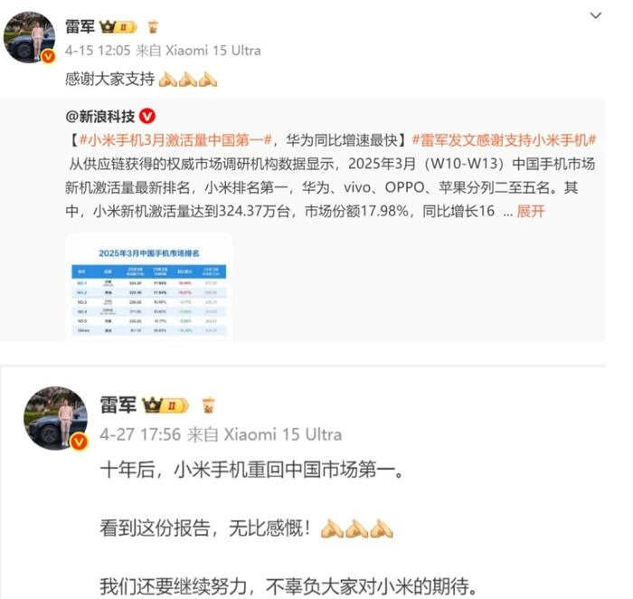 虽然小米陷入舆情风波,但是小米的主业务表现不俗,最新公布的数据显示,小米在2025年3月的手机激活量超越华为成为了第一。这是继2024年11月后,小米再次在中国市场拿下单月激活量第一。雷军在微博停更10日更新了一条微博称“感谢大家支持”4月27日雷军又发文称“十年后,小米手机重回中国市场第一。”