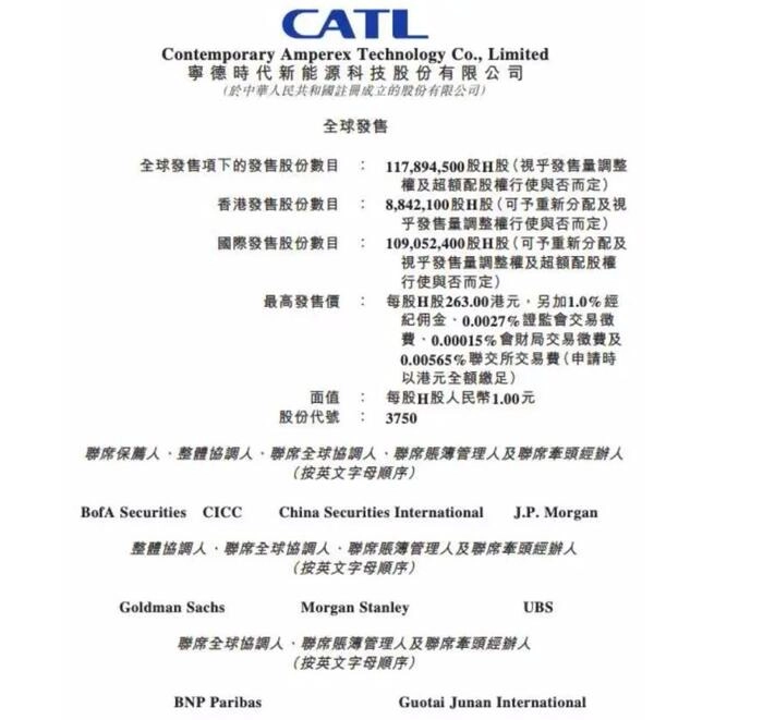 和A股其他公司在港股上市股价远低于A股股价不同,宁德时代港股发行股甚至高于A股现价。根据公告,本次IPO发行价263港元,共发行1.36亿股,募资总额356.57亿港元,扣除发行等费用外净募资353.31亿港元,成为近年来港股市场规模最大的IPO,也有望成为今年全球最大的IPO。