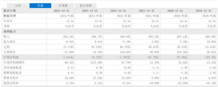 2024年爱奇艺营收292.3亿元,同比下滑8.31%,净利润7.641亿元,同比下滑了60.32%。净利润跌幅远高于营收跌幅是因为净利率的大幅下滑,2024年爱奇艺毛利率24.88%,相比2023年的27.52%的毛利率下滑了2.64个百分点。净利率2.71%,相比上一年的6.13%大幅下滑了3.42个百分点。