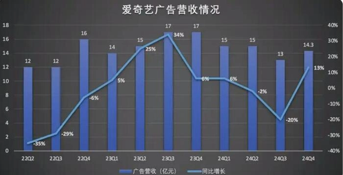 爱奇艺在2024年第四季度在线广告收入同比下降13%,主要由于品牌广告收入减少。全年广告总收入同比下降8%,品牌广告商撤退成为核心拖累因素。尽管同期效果广告(如电商、游戏行业)有所增长,但未能完全抵消品牌广告下滑的影响。