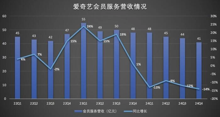 在行业的激烈竞争中,用户的付费意愿被多家竞争平台分流,进而导致爱奇艺全年会员服务收入177.6亿元,同比下降13%导致收入下滑。具体到每个季度,2024年四个季度爱奇艺会员收入分别为48亿元、45亿元、44亿元、41亿元,同比分别下降13%、9%、12%、14%,四个季度没有一个季度实现增长。