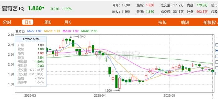 尽管爱奇艺第一时间回应了通报,资本市场反应依然迅速,5月14日,爱奇艺股价应声而跌,让原本就萎靡不振的爱奇艺股价继续走低。截至5月20日收盘,爱奇艺美股股价为1.86美元,再跌1.59%,在2024年全年股价下跌58%的基础上,进入2025年股价又下跌了6%。相比高峰值的46.23美元,跌幅更是高达96%,市值蒸发了427亿美元,最新市值不足18亿美元。
