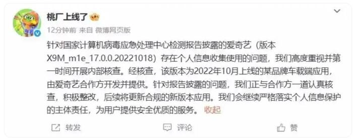 当日,@桃厂上线了(爱奇艺官方微博)正式回应被通报,回应称“针对国家计算机病毒应急处理中心检测报告披露的爱奇艺(版本X9M_m1e_17.0.0.20221018)存在个人信息收集使用的问题”,爱奇艺表示高度重视并第一时间开展内部核查。经核查,该版本为2022年10月上线的某品牌车载端应用,由爱奇艺合作方开发并提供。