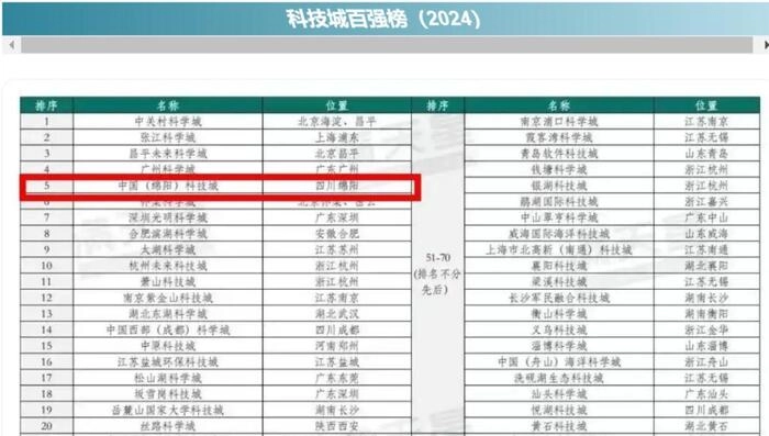 在年初发布的《科技城百强榜(2024)》中,绵阳高居第五位,前四位为北京、上海和广州,以至于有媒体称中国科技城市已经形成了“北上广绵”的格局,甚至高于省会成都。