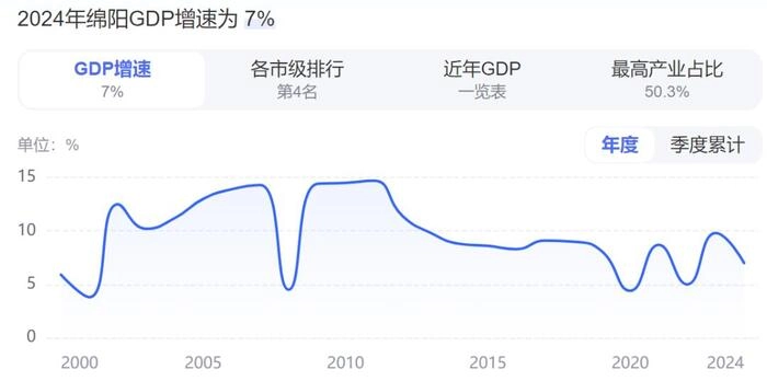 于是绵阳才有2027年GDP超6000亿元的宏伟目标,而2024年绵阳GDP总量为4344.03亿元,到2027年要实现6000亿元的目标,每年至少增长10.54%才能实现目标。这个看似不可能完成的任务,其实在绵阳身上早就实现过。2002年至2007年这期间绵阳均是以10%以上的速度在高速增长,2008年因汶川地震的影响,增速跌至4.5%,但2009年再度恢复至14.41%的增速,2009年至2012年,增速最低的是2012年的11.4%,随后至今的GDP增速虽有所放缓,也都远高于全国平均增速。