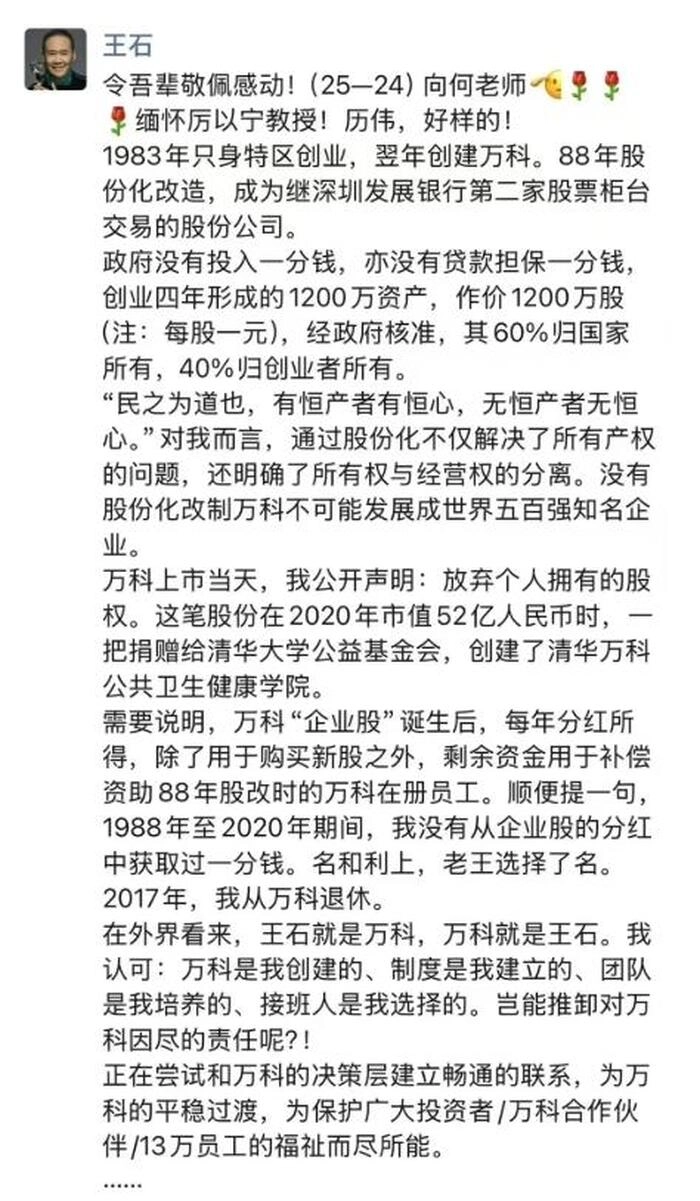 王石在朋友圈发了一段文字:在外界看来,王石就是万科,万科就是王石。我认可:万科是我创建的、制度是我建立的、团队是我培养的、接班人是我选择的。岂能推卸对万科因尽(编者注:此处应该是应尽)的责任呢?!