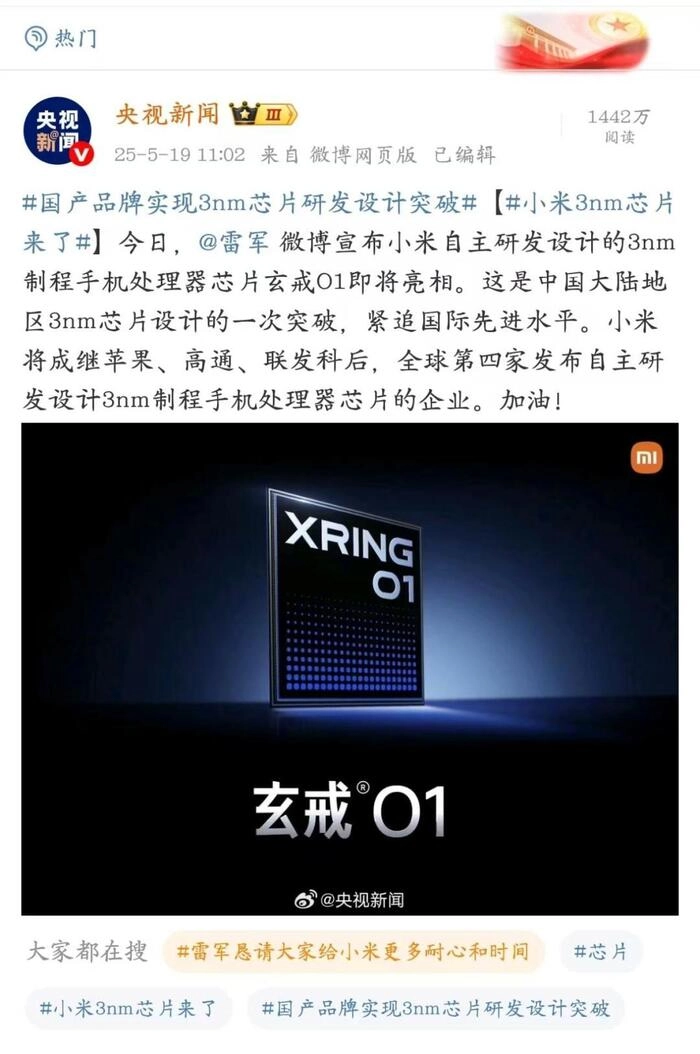 央视新闻报道点赞小米的3nm芯片设计,表示:“这是中国大陆地区3nm芯片设计的一次突破,紧追国际先进水平。小米将成为继苹果、高通、联发科后,全球第四家发布自主研发设计3nm制程手机处理器芯片的企业。加油!”