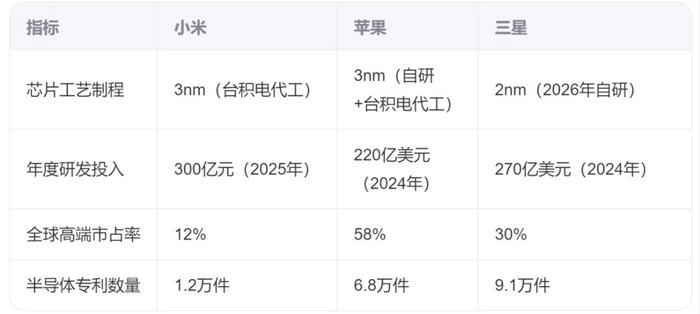 小米芯片4年研发投入135亿元,和苹果、三星相比依然稍显不足。需加速填补AI芯片、自动驾驶等领域的专利空白,当前半导体专利数量仅为高通1/3。公开资料显示,台积电2nm工艺2026年量产,小米需同步跟进制程迭代能力。