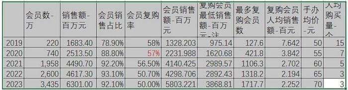 会员复购率的问题,泡泡玛特在2024年财报数据显示,其会员复购率一路走低,从 2019 年的 58% 下降到 2023 年的 50%,再降到2024年的 49.4%。