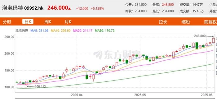 如果从2022年10月开始计算,在两年半的时间,泡泡玛特股价确实翻了20多倍,从2022年10月28日的9.8港元/股,涨到2025年6月4日的246港元/股,市值3304亿港元,成为新消费第一股。