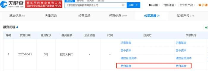 面对业绩增速放缓,市场消费疲软的境况,茅台的跨界投资引发投资者的注意。投资面壁智能是茅台跨界投资的尝试。天眼查显示,面壁智能在5月21日获得数亿人民币的融资,除了洪泰基金、国中资本等知名机构外还有茅台基金。