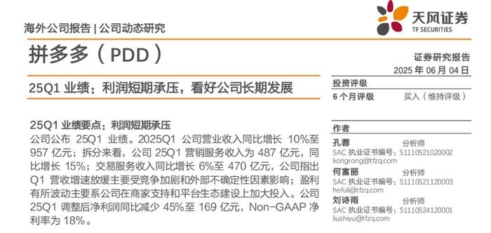 华安证券也看好拼多多的长期增长潜力,继续维持拼多多(PDD.O)优于大市评级。“尽管短期受补贴和关税政策影响,但拼多多通过多元化市场和本地仓发货策略对冲风险,预计2025-2027年收入和经调整净利润将实现稳健增长。风险包括宏观经济波动、海外业务拓展不及预期及竞争加剧。”天风证券也在研报中看好拼多多的长期发展。