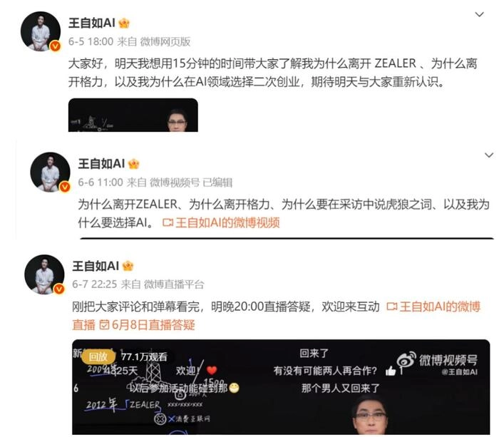 近日,在王自如37岁生日之际,在社交账号上宣布,将用15分钟解释为什么离开ZEALER、离开格力,并透露自己将二次创业,选择的是AI领域。随后6月6日如约开播。