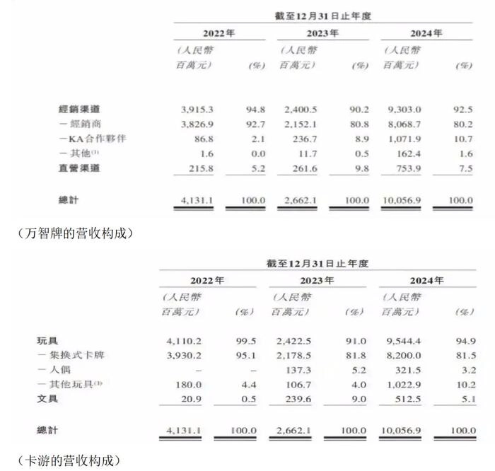 李奇斌的这一步走对了,卡游靠着奥特曼等热门IP,外加产品的青少年社交属性以及抽奖“商业陷阱”,愣是把成本不到5毛一包的卡牌,卖到1.7元起步。2018年到2024年底,卡游基于50多个奥特英雄角色推出了共计320个集换式卡牌系列及42个文具系列,奥特曼IP也成为卡游旗下最赚钱的IP之一。大IP卡片或成为卡游的“营收主力”,2022年营收41.31亿元,2024年就暴涨至100.57亿元,两年就翻了一倍有余。