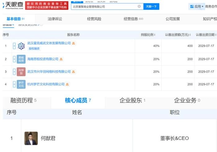 天眼查显示寰聚商业在6月19日发生股权变更,武汉星竞威武文体发展有限公司成为持股40%的大股东,而武汉星竞威武文体发展有限公司的董事长兼CEO就是澳门赌王之子何猷君。其控股的星竞威武 (香港) 有限公司100%实控武汉星竞威武文体发展有限公司,这意味着何猷君收购了寰聚商业。