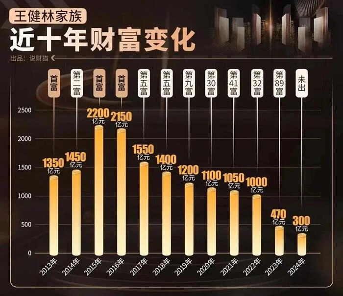 尽管王健林现在一直在甩卖资产,不断出售万达广场等资产变现,给人一种很缺钱的感觉,万达可能很缺钱,但是王健林不一定缺钱。据《中国基金报》2024年报道王健林、王思聪父子的财富1408亿元重回前十。但进入2025年,王健林因万达业务导致个人财富迅速缩水,家族财富萎缩至300亿元,最新的中国福布斯富豪榜上王健林、王思聪父子跌出榜单前100位。