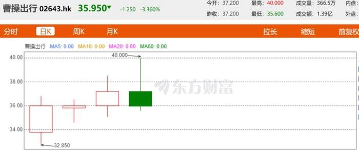近日,曹操出行登陆港交所,股票代号02643.HK,每股发行价为41.94港元,成为港股最大的出行平台。6月25日曹操出行上市首日,股价即破发,股价最高跌幅一度超过30%,最终收跌逾14.16%至36.00港元/股。6月26日、27日,曹操出行股价有所回升,但截至6月30日收盘,曹操出行股价再跌3.36%,最新股价35.950港元,相比41.94港元的发行价,跌幅达14.3%。最新市值195.6亿港元。