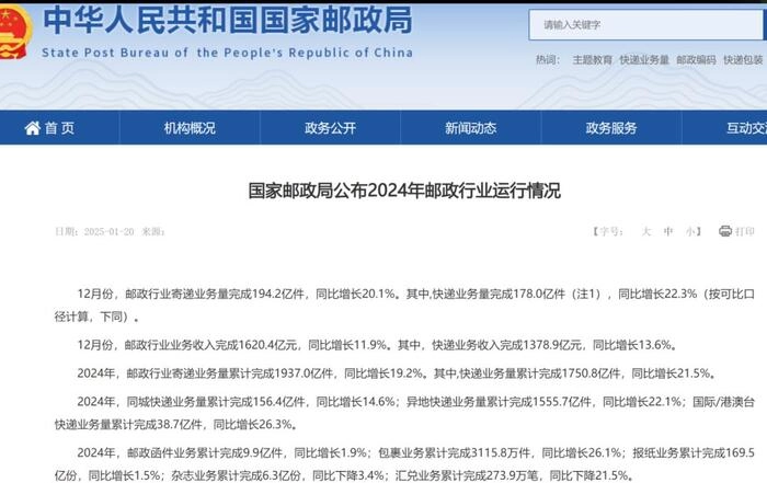 2025年年初,中华人民共和国国家邮政局公布了中国邮政2024年营收状况,2024年,邮政行业寄递业务量累计完成1937.0亿件,同比增长19.2%。其中,快递业务量累计完成1750.8亿件,同比增长21.5%。2024年,邮政行业业务收入(不包括邮政储蓄银行直接营业收入)累计完成1.7万亿元,同比增长10.7%。其中,快递业务收入累计完成1.4万亿元,同比增长13.8%。