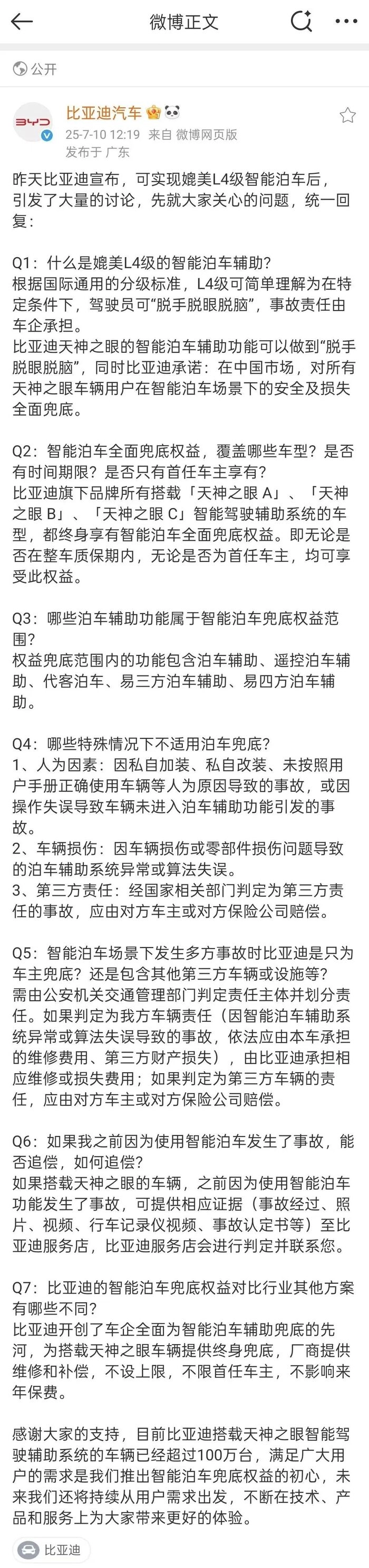责任划分是革命性的突破。L4级的关键特征是“在限定场景下完全自主操作,事故责任由系统方承担”。这意味着比亚迪承诺“在智能泊车场景下对安全及损失全面兜底”(如下图Q&A),跟当前行业普遍的责任模糊状态比优势显著,以保障消费者利益为出发点,赢得更多信任。
