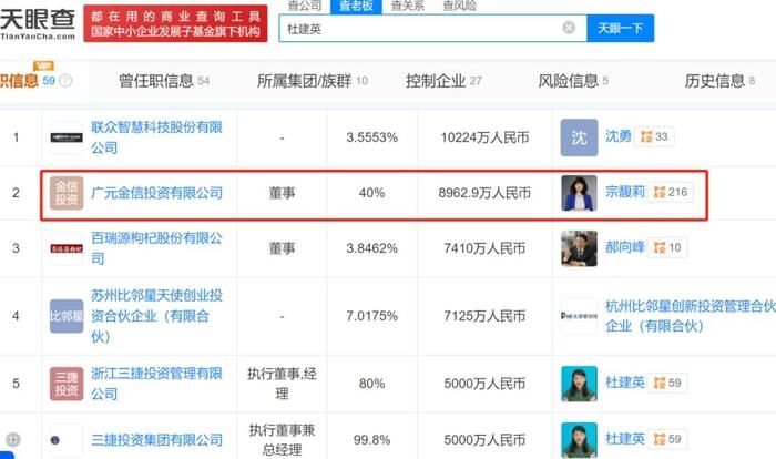 宗庆后家族的复杂性远超公众想象。除原配施幼珍育有一女外,其与杜建英的非婚生子女早年鲜少曝光,却通过商业纽带悄然渗透娃哈哈体系。公开资料显示,广元金信投资宗馥莉是企业法人,持股60%,第二大股东就是杜建英,其持股40%,如果杜建英和宗庆后关系一般,其早在2008年就已经从娃哈哈离职,此时也很难和宗馥莉共同持股。
