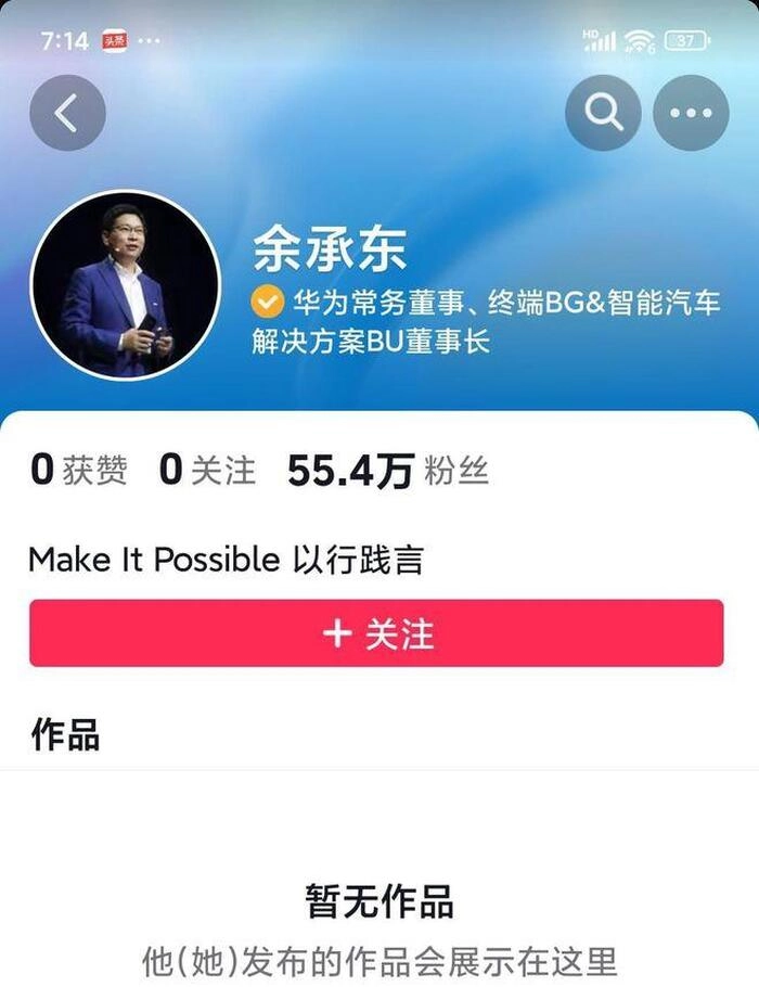 余承东入驻抖音的时间并不长,2024年12月12日晚,余承东才开通账号并通过官方认证,尽管当日未发布作品,依然引发巨大关注,话题“余承东入驻抖音”冲上抖音热榜第一。次日在没有发布作品的情况下,单日涨粉超40万,成为未发布作品就收获粉丝数量最多的企业家。