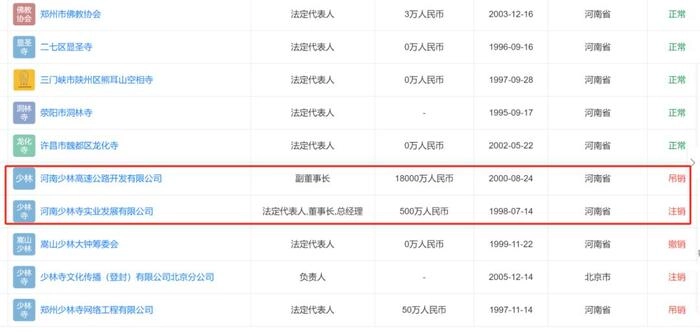 此时的释永信早不是那个带着干粮徒步游历的小沙弥,常佩戴价值不菲的佛珠、袈裟。随着商业版图的扩张,释永信的名字愈发与金钱挂钩。天眼查显示他名下或关联公司多达18家,业务涉及文化传播、旅游、茶叶、影视、健康产业等多个领域。有意思的是,其关联企业有多家已经吊销。