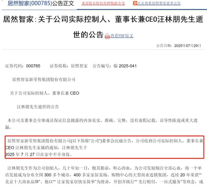 7月27日,有官媒报道称居然智家(即原居然之家)董事长、实控人前家居首富汪林朋跳楼身亡。次日居然智家发布公告证实了报道消息。这位2024年还荣获中国十大品牌领袖的57岁企业家在解除留置后第三天选择了自杀。
