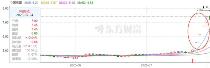 中国电建作为该项目参研参试参建单位,7月21日、22日、23日和24日连续四个交易日涨停。7月25日的7.84元高点创下近3年新高,甚至一度逼近历史最高值。