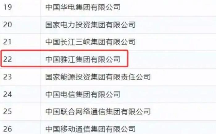 新组建的中国雅江集团有限公司在国资委最新更新的99家央企名录中位列第22位,位于中国长江三峡集团之后,国家能源投资集团之前,甚至高于电信、联通和移动三大运营商。