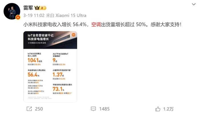 2025年Q1空调出货量超110万台,同比增速超65%,2025年前8周线上销售额同比暴涨73%,市场份额跃升至11%。随后小米空调单月份额持续攀升,4月14.25%到5月的17%再到6月16.5%,增速领先传统品牌,雷军在3月9日专门发文庆祝。