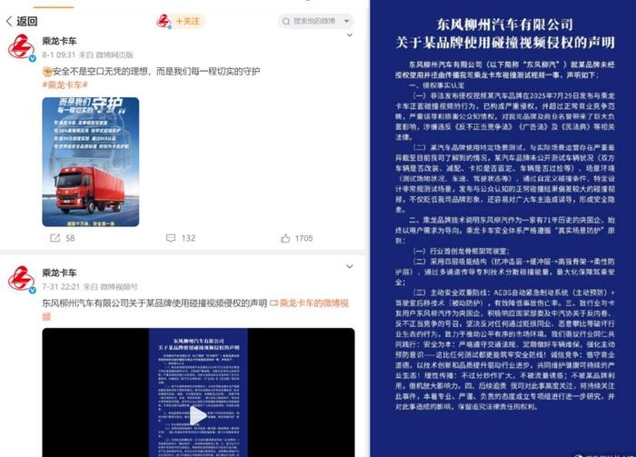 作为拥有71年悠久历史的老牌国企,乘龙卡车在声明中称“某汽车品牌在2025年7月29日发布与乘龙卡车正面碰撞视频的行为,已构成严重侵权”,乘龙卡车认为理想超过正常商业竞争范畴,严重误导和损害公众知情权,对自身品牌及商业名誉带来了巨大负面影响,理想涉嫌违反《反不正当竞争法》《广告法》及《民法典》等相关法律。乘龙卡车正在启动法务部追究法律责任的权利。