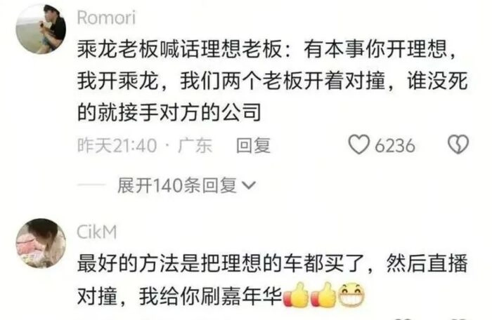众多网友对其碰撞测试结果也不认可,有网友喊话理想再复测一把,理想汽车产品规划高级总监张骁回应称“可以,直播都行”,于是又有网友看热闹不嫌事大,喊话李想,让李想驾驶理想i8和乘龙卡车老总驾驶的乘龙卡车来次“一决生死”的碰撞,李想和理想汽车都没有对此回应。