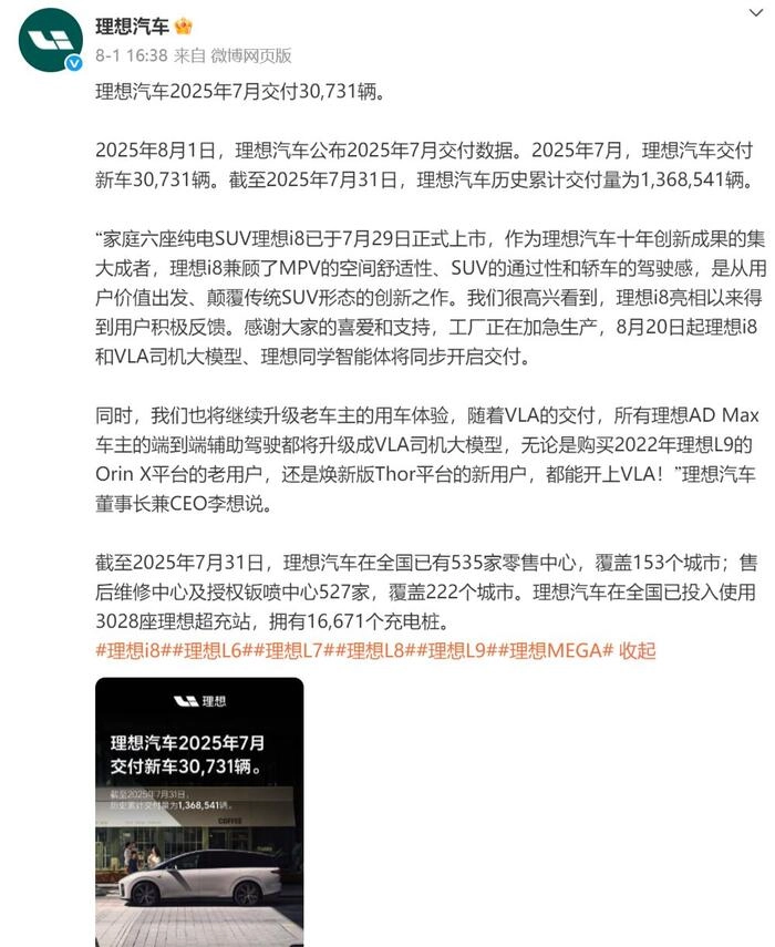 汽车媒体人张智勇认为造车新势力频频出现“出格宣发”根源或因为销售压力,理想汽车在2025年7月的交付量为30,371台,这一数据相比2024年同期的51,000台下降了近40%,环比6月也减少了16%。截至2025年7月31日,理想汽车历史累计交付量为1,368,541辆。