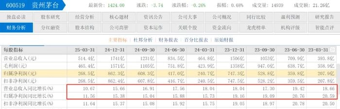 茅台在今年一季度表现中规中矩。据财报显示,一季度茅台营收514.4亿元,同比增长10.67%;归母净利润268.5亿元,同比增长11.56%。看似不错,但去年同期两项数据的同比增幅分别为18.04%和19.16%,增幅明显放缓,且该季度的增幅已经是近年来增幅最低。