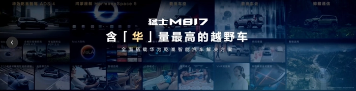8月17日,全球首款搭载“全栈华为”的越野SUV--猛士M817在成都正式上市。华为智能汽车解决方案BU CEO靳玉志接受专访时表示与猛士的合作开创了智能越野新品类。越野场景的智能化也标志着'可城可野可远方'的全场景出行时代正式开启。”