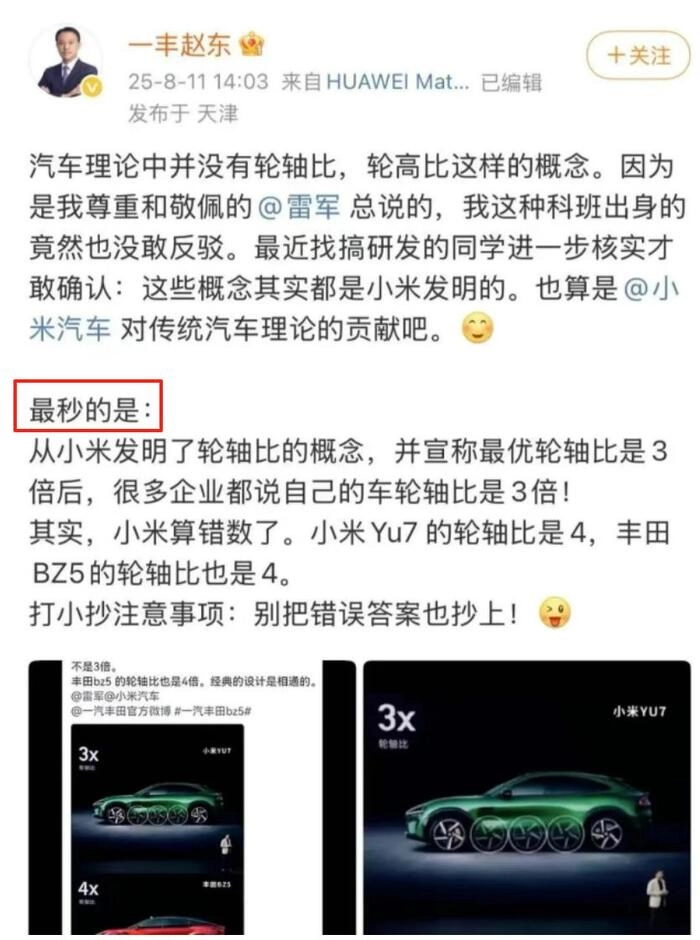 一汽丰田销售公司企划部部长赵东发文称:“汽车理论中并没有轮轴比、轮高比这样的概念,因为是我尊重和敬佩的@雷军总说的,我这种科班出身的竟然也没敢反驳。”这原本是恭维的客套话,但他话锋一转表示,“最近找研发的同学进一步核实才敢确认,这些概念其实都是小米发明的,也算是@小米汽车对传统汽车理论的贡献吧。”