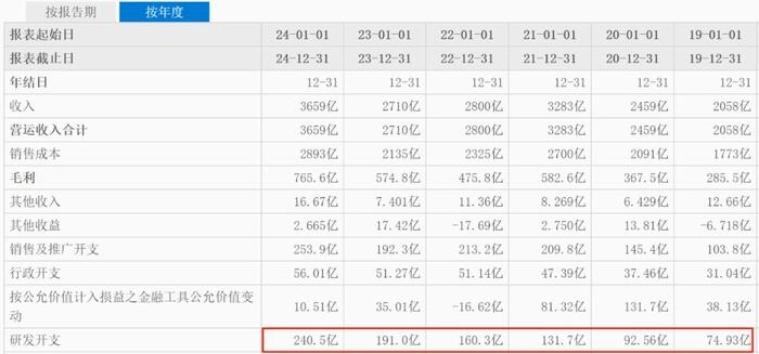 此前小米并不以高研发占比(研发费用占总营收的比例)著称。财报显示2019年至2021年,小米研发占比分别为3.6%、3.7%和4%,但从雷军宣布造车以来小米的研发费用逐年走高,2022年至2024年,小米研发费用分别为160.3亿元、191亿元和240.5亿元,同比增幅为19.2%和25.9%,研发占比分别为5.7%、7%和6.6%。