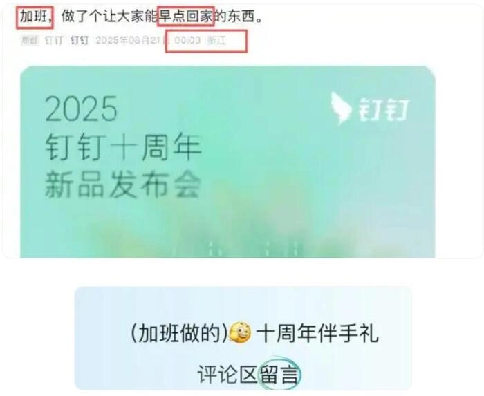 有意思的是,在当日消息曝出的凌晨0:03分,钉钉官方公众号卡点发了一条推文,标题是“加班,做了个让大家能早点回家的东西。”钉钉在文章中多次强调“加班”关键词,例如抽奖赠送的伴手礼也是“加班做的”。官方账号的运营者还点赞网友“标题取得好”的留言。