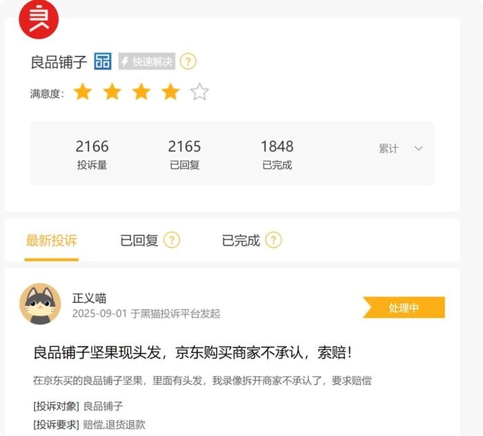 黑猫投诉显示良品铺子累计投诉超过2000条,基本都是产品质量问题。