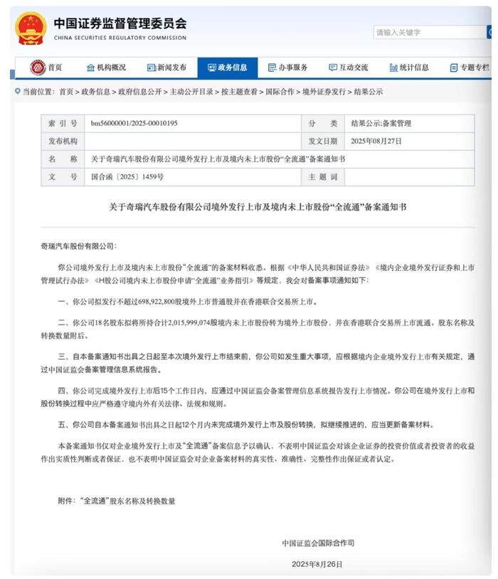 8月26日,中国证监会官网刚发布《关于奇瑞汽车股份有限公司境外发行上市及境内未上市股份“全流通”备案通知书》,这意味着奇瑞汽车港股IPO上市完成了关键流程节点,甚至网上热传奇瑞将在9月9日敲钟,连股票代码都已经被说非常有内涵。有意思的是,奇瑞旗下的伯特利、埃夫特、瑞鹄模具、鸿合科技等企业均已上市,奇瑞作为主体一直迟迟未能上市,奇瑞一旦港交所上市成功,奇瑞系上市集群将极为庞大。
