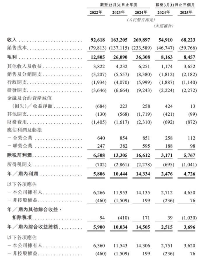 奇瑞之所以有望成为港股年内最大车企IPO,和其自身亮眼的业绩表现不无关系。招股书显示,近三年,奇瑞营收分别为926.18亿元、1632.05亿元和2698.97亿元,增幅分别为76.2%和65.4%。2022年至2024年,奇瑞净利润分别为58.06亿元、104.44亿元、143.34亿元,同比增长80%和37%。这样的营收和净利润表现在自主品牌车企中已属优异,尤其是营收和净利润的增幅稳居众多车企的前列。乘用车销量增速达38.4%,稳居全球前二十大车企之首。